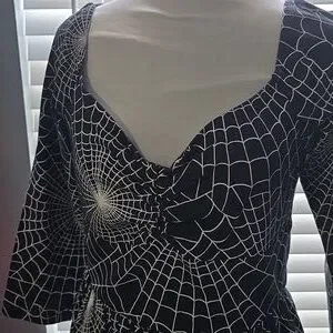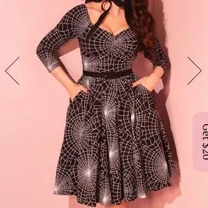 Creepy, crawly, and cute, our new spider web print dress is the perfect way to haunt your closet. Micheline Pitt's iconic spider web print is displayed in a new style called the Wicked Swing Dress. This sinister and sweet style is the "Tie Me Up" fit re-imagined into a dress. The bodice is fully lined in self-fabric, has a removable black belt, and of course, has everyone's favorite POCKETS!