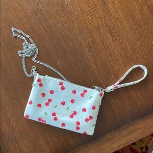 Charming Charlie wristlet with cherry print. Features a detachable chain strap. Perfect for casual outings.