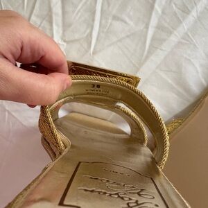 These Roger Vivier sandals feature a striking metallic gold finish and a distinctive square buckle ornament. Crafted with a minimalist design, they offer a modern aesthetic perfect for both casual and semi-formal occasions. 100% Authentic and final sale!