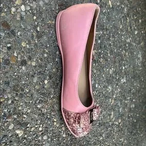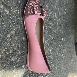 Charming pink dress shoes for kids. Features glittery bow detail. Perfect for special occasions.