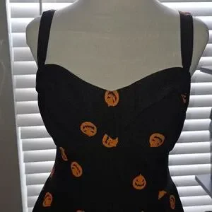 The ultimate swing dress in a festive Halloween Pumpkin King print! Boasting an all-over pumpkin print featuring Micheline Pitt's original art and the same supportive bust that you know and love. Made from a division of bengaline called millennium, this firm yet soft fabric will allow for a flattering fit on almost all body types. The dress bodice is fully lined in ITY, excluding the bust which is lined in self. The Maneater swing dress has deep wonderful pockets that you know and love from Vixen. The dress is finished with adjustable straps, a back zip, no belt.