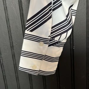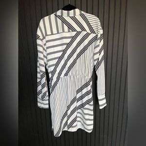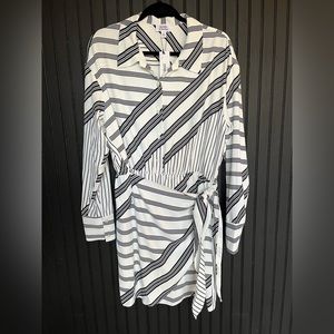 Black and white faux wrap dress with button up top. Button cuff sleeves. 100% polyester. Machine wash.