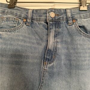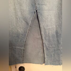 Stylish denim maxi skirt featuring a front slit. Perfect for casual outings.
