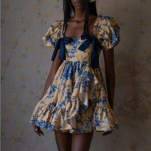 Selkie “The Musée Buttercream Dress” Yellow base with navy blue artwork and bow accents. Love this dress, only wore it once and it has been kept in a garment bag.