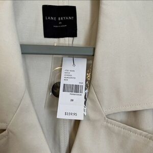 This elegant cream trench coat from Lane Bryant features a belted waist and epaulettes, offering a timeless and sophisticated look. The coat's classic design includes a double-breasted front and wide lapels, making it a versatile addition to any wardrobe. Crafted for both style and functionality, it is perfect for any occasion. New with tags! Could use a steaming