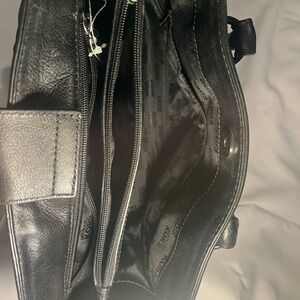 Elegant black patent leather satchel. Features sturdy handles and sleek design. Perfect for any occasion.