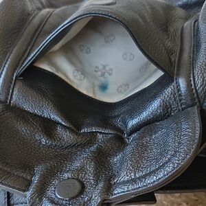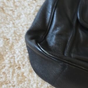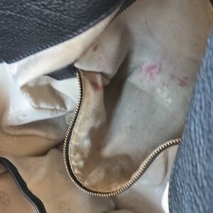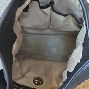 This Tory Burch shoulder bag in black leather features a sleek design with a signature gold medallion logo. Its versatile style is perfect for both casual and semi-formal occasions. This is definitely one of my favorite shoulder bags! I love the roominess and the soft black leather. It does show some over-loved wear on the bottom corners and some lipstick stain on the inside of a zipper pocket. But, overall, this bag is still in really good condition.
