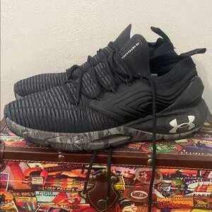 Experience superior performance with Under Armour's athletic shoes, showcasing a sleek black and gray colorway. The knit textile upper features a textured pattern, while the speckled midsole ensures optimal cushioning. Enjoy a snug fit with the innovative lacing system and sock-like collar. Pre owned excellent condition