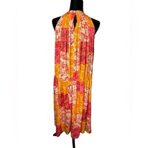 Embrace vibrant style with this stunning floral halter maxi dress. Featuring a beautiful blend of orange and pink hues, this dress is perfect for any occasion. The flowing design offers comfort and elegance.