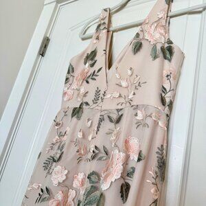 The Tatum V-neck bridesmaid dress features wide straps, a fitted bodice and a slim A-line skirt. It has a blush colored lining with a blush and green floral embroidery tulle layer on top. The tulle layer is attached in the top portion in the dress but flows nicely over the waist and legs.