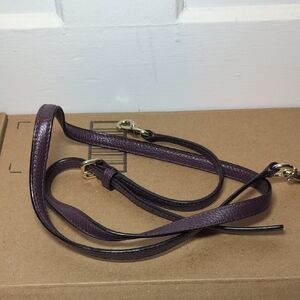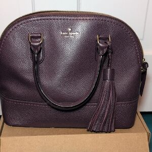 This sophisticated Kate Spade satchel in a striking purple hue is crafted from pebbled leather, offering a semi-rigid structure that maintains its shape. The bag features a domed silhouette, double top handles, and a chic tassel detail, making it a perfect accessory for everyday elegance.