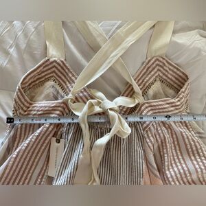 NWT size L. Measurement from pit to pit is 14 inches, stretching the elastic back takes it to a maximum of 18” across the back. Length is 24” to shortest part of the handkerchief hem and 32” to the longest, although that can be adjusted with how you adjust the straps in back. Reposhing due to not a fit in the bust.