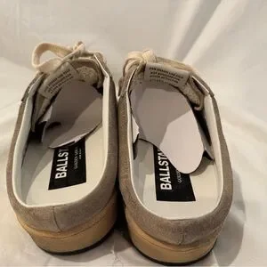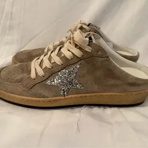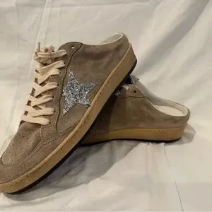 Golden Goose Beige Suede Sneakers with White Laces and Silver Glitter Star