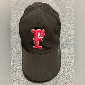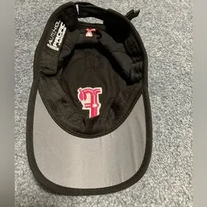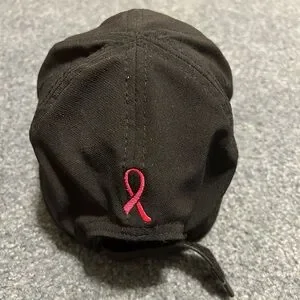 Women’s black Firecracker hat with pink “F” on front embroidered and pink Cancer awareness ribbon embroidered on the back with Velcro adjustable strap for sizing. In like new condition without tags.