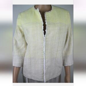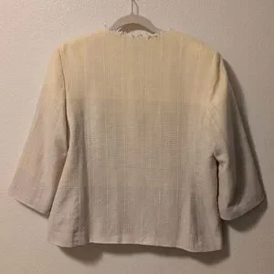 Experience the perfect blend of style and comfort with this cream blazer from Alfred Dunner. Its collarless design and relaxed fit offer a modern, minimalist look, making it an ideal choice for versatile wear. Crafted with a soft texture, this blazer is a must-have addition to any wardrobe. One clasp closure, pockets.