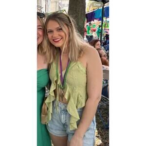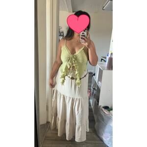 This Cider tie-front tank in sage green features delicate ruffled lace trim, adjustable straps, and a plunging V-neck. Unlined and unworn—perfect for cottage-core or festival styling.
