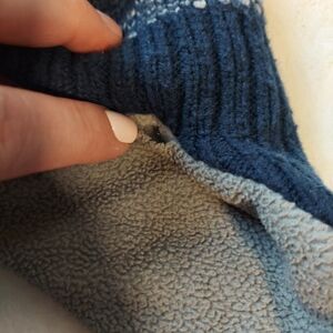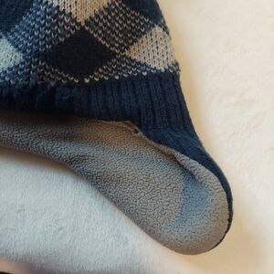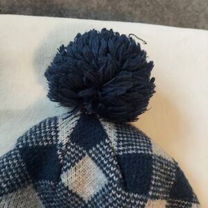Keep your child warm with this stylish blue and gray winter hat. Perfect for chilly days.