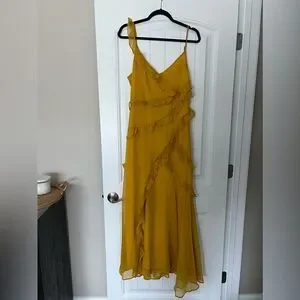 Elegant yellow maxi dress. Features ruffle details. Sleeveless design. Perfect for special occasions.