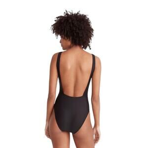 Make from a feel-good recycled fabric. A square neck with low back and a flattering legs-for-days cut. Light support with a shelf bra, moderate seat coverage, UPF 50 sun protection. MD325. Black. Size large