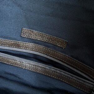 Beautiful distressed leather bag features zipper closure, two outer zipper pocket, one magnet closure small patch outer pocket, two glasses inner pockets, one inner zipper compartment, canvas strap.
