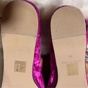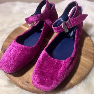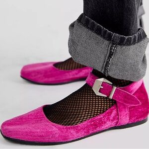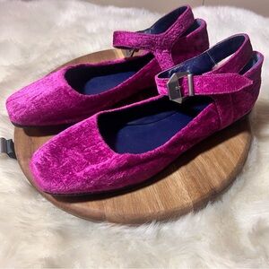 Vibrant fuchsia fizz velvet flats. Features an adjustable strap. Perfect for stylish comfort.
