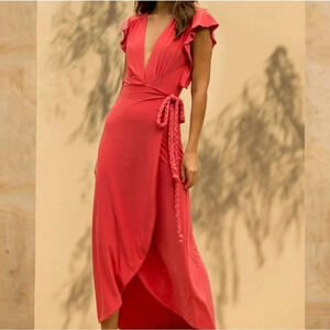 This elegant red sundress by Misa Los Angeles is designed with a flattering wrap style and a graceful V-neckline. The flutter cap sleeves and ruffled details add a touch of sophistication, making it ideal for wedding guest or cocktail occasions. Its midi length and flowing silhouette ensure a chic and timeless look.