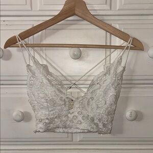 Airy crochet plays up the romance of a longline bralette backed with crisscrossing straps and a comfortable panel of shirred lace.