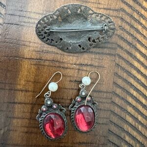 Elegant vintage-inspired jewelry set featuring a stunning red stone. Perfect for adding a touch of classic charm to any outfit.