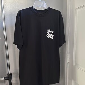 This Stussy tee showcases a striking black and white design, featuring the iconic brand logo and a bold graphic of white dice. Crafted from quality fabric, it offers a comfortable fit with a classic crew neck style, making it a standout piece for any casual wardrobe.