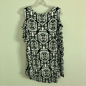 Plus size cold shoulder top from JM Collection with short sleeves and black, white, and tan pattern. Size 1X. Approximately 23 inches from pit to pit and 28 inches from shoulder to hem. 95% rayon 5% spandex. Machine washable. Smoke free and pet friendly home!