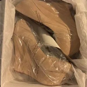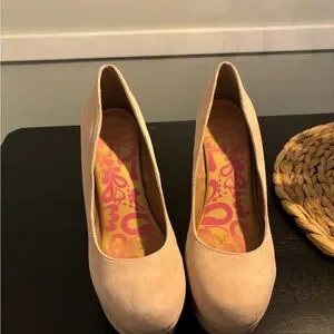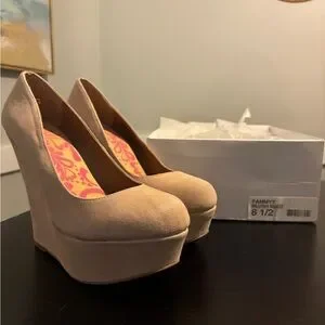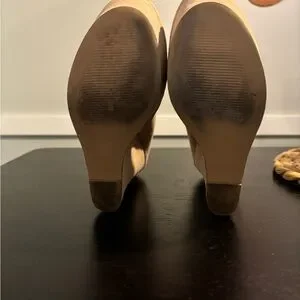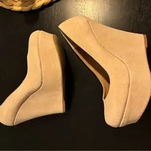 Beautiful condition blush suede wedges! Tall wedge but very comfortable - only issue is the insole cushion. I did not remove it as it pulls away the fabric (see photo). These were worn maybe less than 10 times and stored carefully (see photo). Suede looks amazing :) let me know if you have any questions!