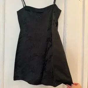 Chic black mini dress with subtle floral patterns. Perfect for a night out. Sleek and stylish design. In perfect condition