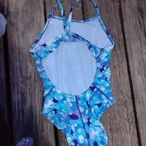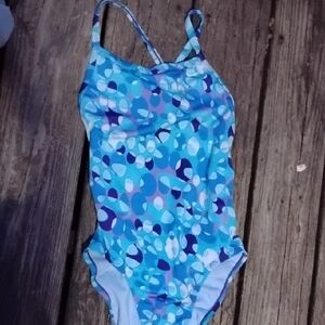 Dive into style with this Nike one-piece swimsuit, showcasing a vibrant blend of blue and purple hues. The sleek design offers a comfortable fit, perfect for swimming or lounging by the pool.