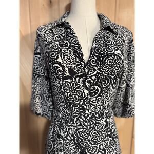 Zara | Black and White Print Short Sleeve Belted Button Down Dress | Size S