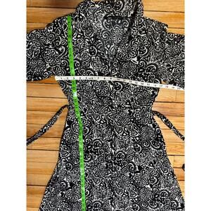 This Zara shirt dress features a pretty black and white print pattern. Full front buttons with removable matching fabric belt. Collared neckline with V neck.
