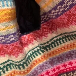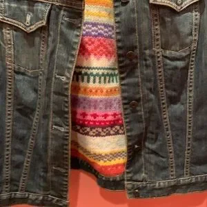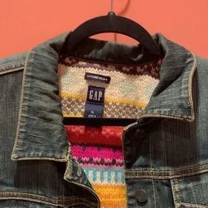Stylish GAP jean jacket. Dark blue denim. Features vibrant multicolor inner lining. Perfect for casual wear.