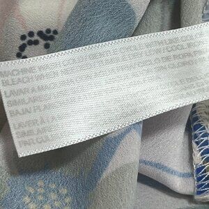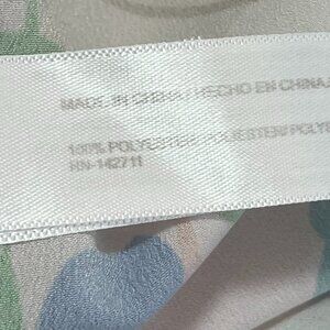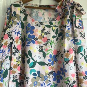 This is a super cheerful multi color floral blouse with shoulder tie accents. The pink, blue and green colors are beautiful together. The neck is scooped, and the sleeves are long. It is 100% Polyester and is lightweight and breezy.