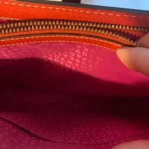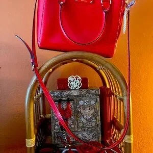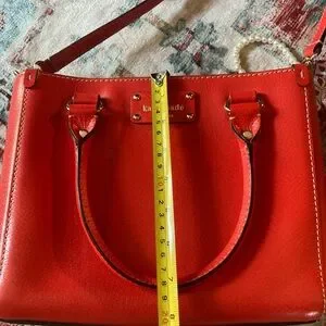 This vibrant NWOT red satchel from Kate Spade features a structured design with double top handles and a zip-top closure. Its sleek, rectangular shape and minimalistic style make it a versatile choice for everyday use, while the striking color adds a bold touch to any outfit. Beautiful true leather, alphabet pink interior and two sections with a zippered pocket and two card sized pockets. Excellent condition with one very minor call out-missing a stitch on one of the backside handles that in no way affects appearance or functionality. Comes with the super cute strawberry charm.