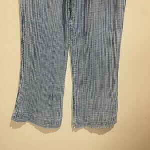 Faherty Dream Cotton Gauze Wide Leg Pant Light Indigo Wash. Crinkle gauzy lightweight material. Variable dyed faded light blue color. Smocked elastic waist. Pull on. 100% organic cotton.