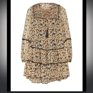 Chic floral mini dress with long sleeves. Features a delicate pattern in black and tan.