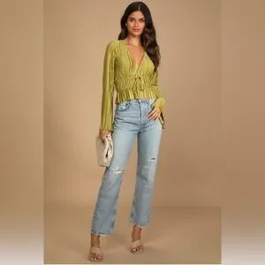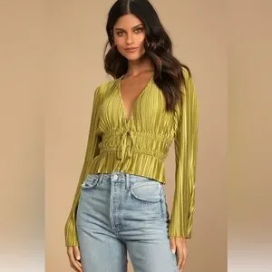 Start the day off on a positive note with the Lulus Staying Optimistic Chartreuse Pleated Bell Sleeve Top! Pleated satiny woven fabric shapes this top that has a plunging V-neckline and long bell sleeves. The fitted bodice is accented with tiers of elastic and a decorative tie at the front.