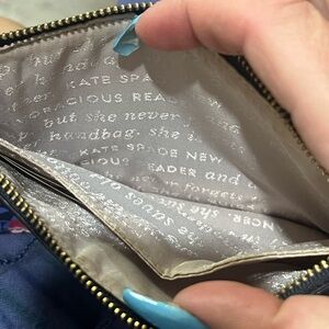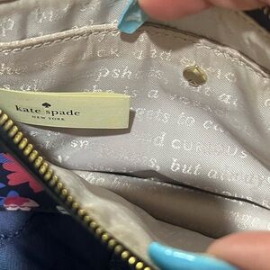 Kate Cameron Street Daisy Leila Wristlet in Floral Multi. Wristlet features a crosshatched, black/pink/white/periwinkle blue PVC exterior in a floral daisy pattern with gold-tone hardware and name plate, 6" matching wrist strap, zip top closure, Kate Spade capital jacquard lined interior, and 2 interior compartments. Wristlet has been used a few times with no signs of use. Retail $88