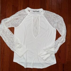 This elegant women's top features delicate lace sleeves, perfect for adding a touch of sophistication to any outfit. The crisp white color makes it versatile for various occasions.