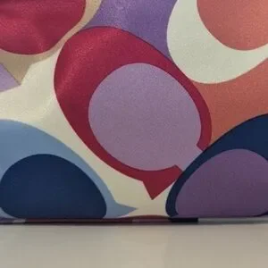 This is in like new condition with tan patent leather piping and hang tag. Coach cosmetics/scarf bag in reds, pinks, purples and navy blue with a zippered top. This is in a dome shape and is perfect for your makeup or to travel with. Zip top.