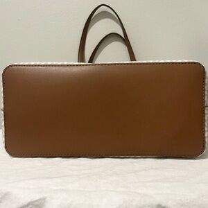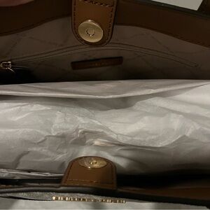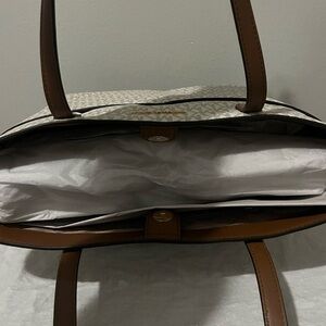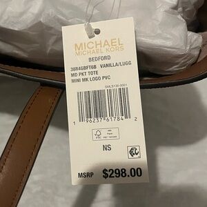 MICHAEL KORS- BEDFORD MD PKT Tote Bag Mini MK Logo in Vanilla/LUGG. Vanilla cream color with all over print and Brown/Tan handles and bottom of purse. Snap button closer to prevent your things from falling out. Features inside zipper pocket. Also has pockets on outside of purse front and back.