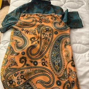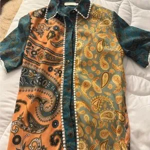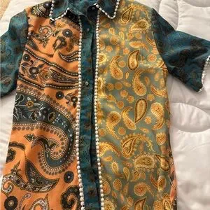 Vibrant paisley patchwork shirt with short sleeves. Features orange, teal, and gold patterns. Button-up front with decorative trim.
