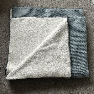Soft knit blanket with a blue exterior and white fleece interior. Perfect for warmth and comfort.
