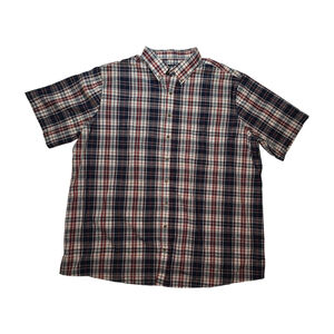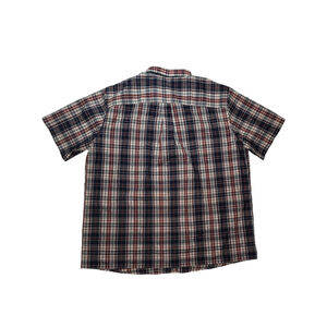 This is a lot of two pre-owned Harbor Bay men's short-sleeve button-down shirts. Both shirts are size 2XLT and are made of a cotton blend. The first shirt is green, black, and white plaid. The second shirt is navy, red, and white plaid. Both shirts have a single chest pocket and a button-down collar. The shirts are in good condition with no visible rips or tears.