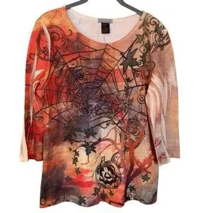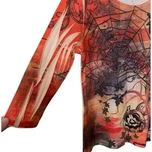 Halloween 3/4 Sleeve Tshirt Top Womens Size M Spiderweb Sparkle Orange Pumpkins