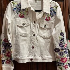 This Boston Proper jean jacket features a crisp white base with elegant pink floral embroidery on the sleeves. Its tailored, collarless design and cropped length create a modern silhouette, perfect for adding a touch of sophistication to any outfit.
